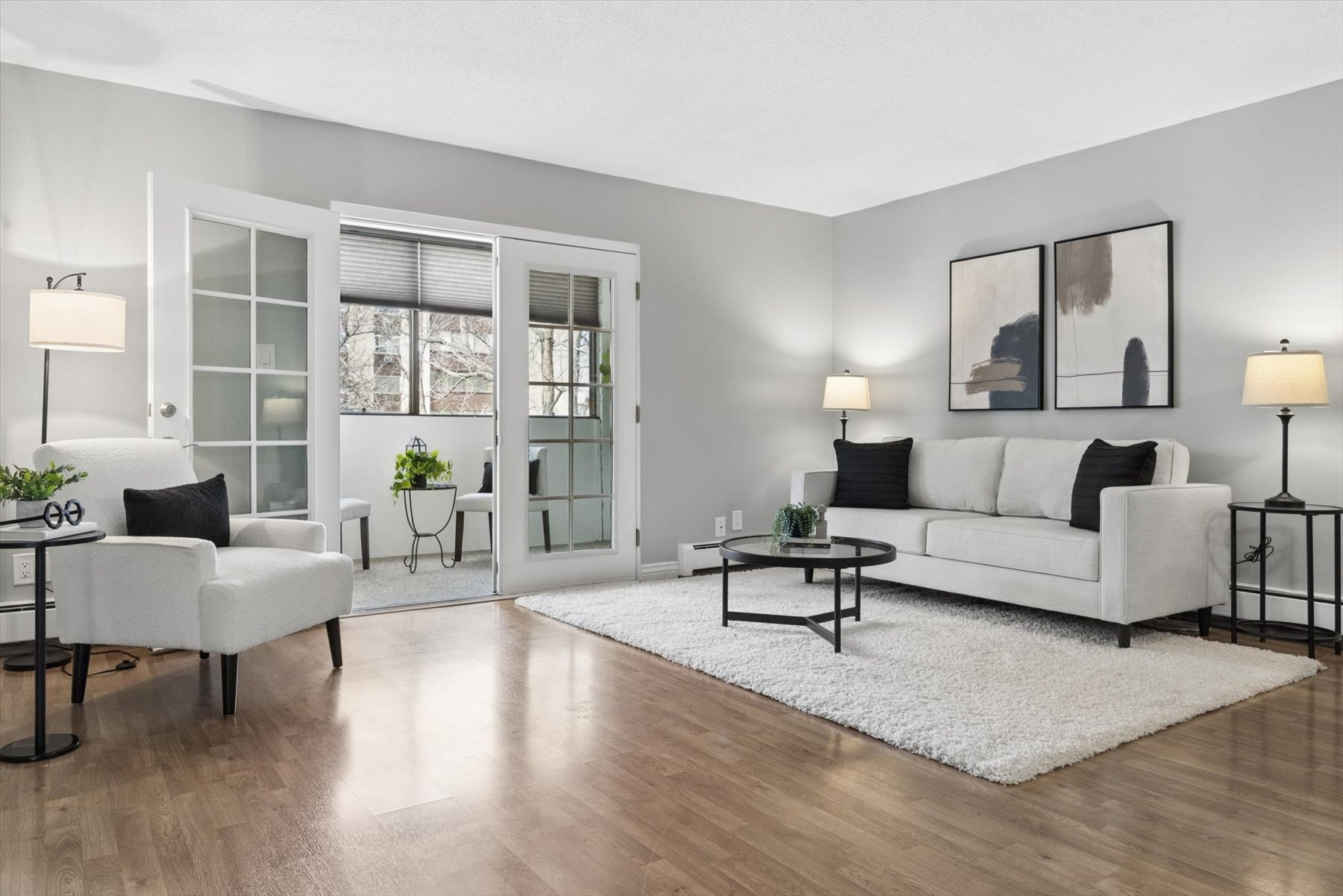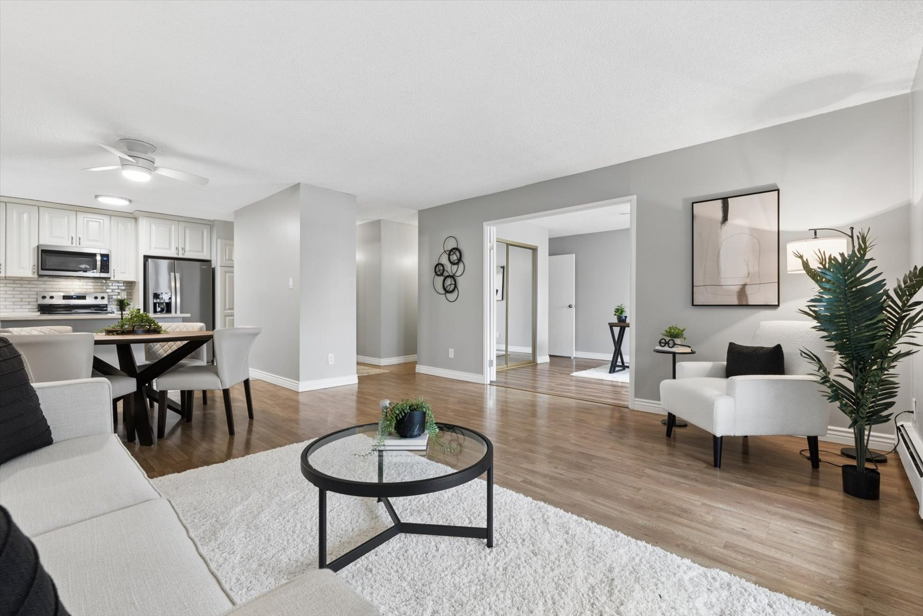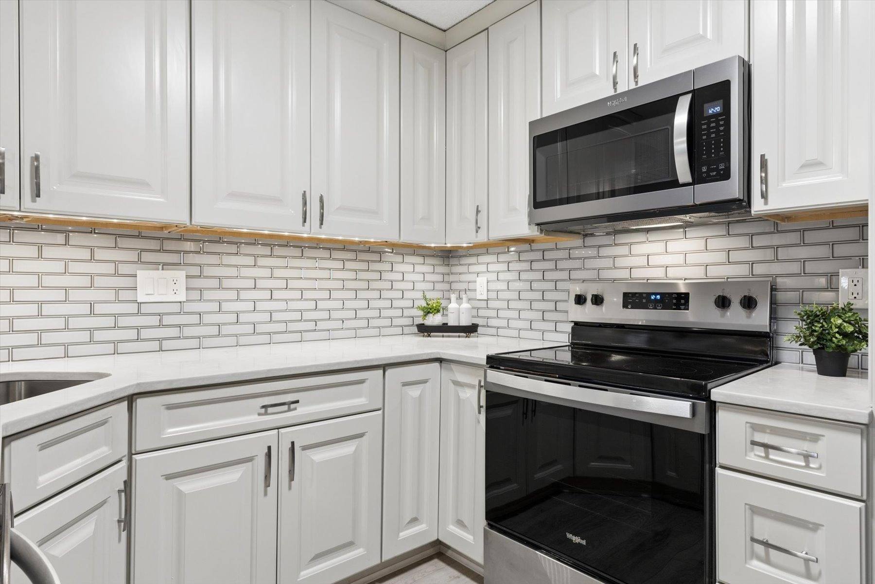 The remodeled kitchen features expanded quartz countertops, a stylish glass-brick backsplash, new self-close cabinets with under-cabinet perimeter lighting, and newer stainless steel appliances. The dining area has a wine cooler for your favorite wines—perfect for entertaining!