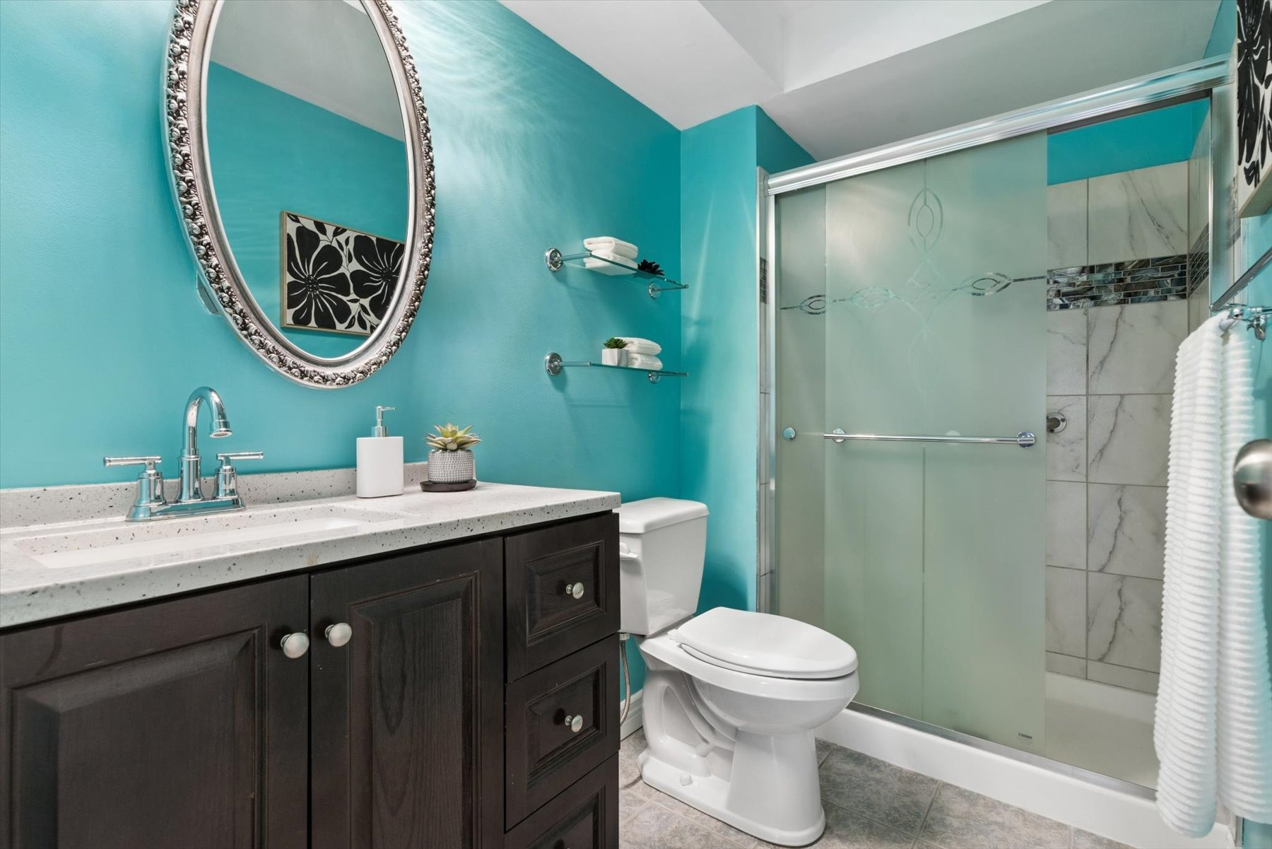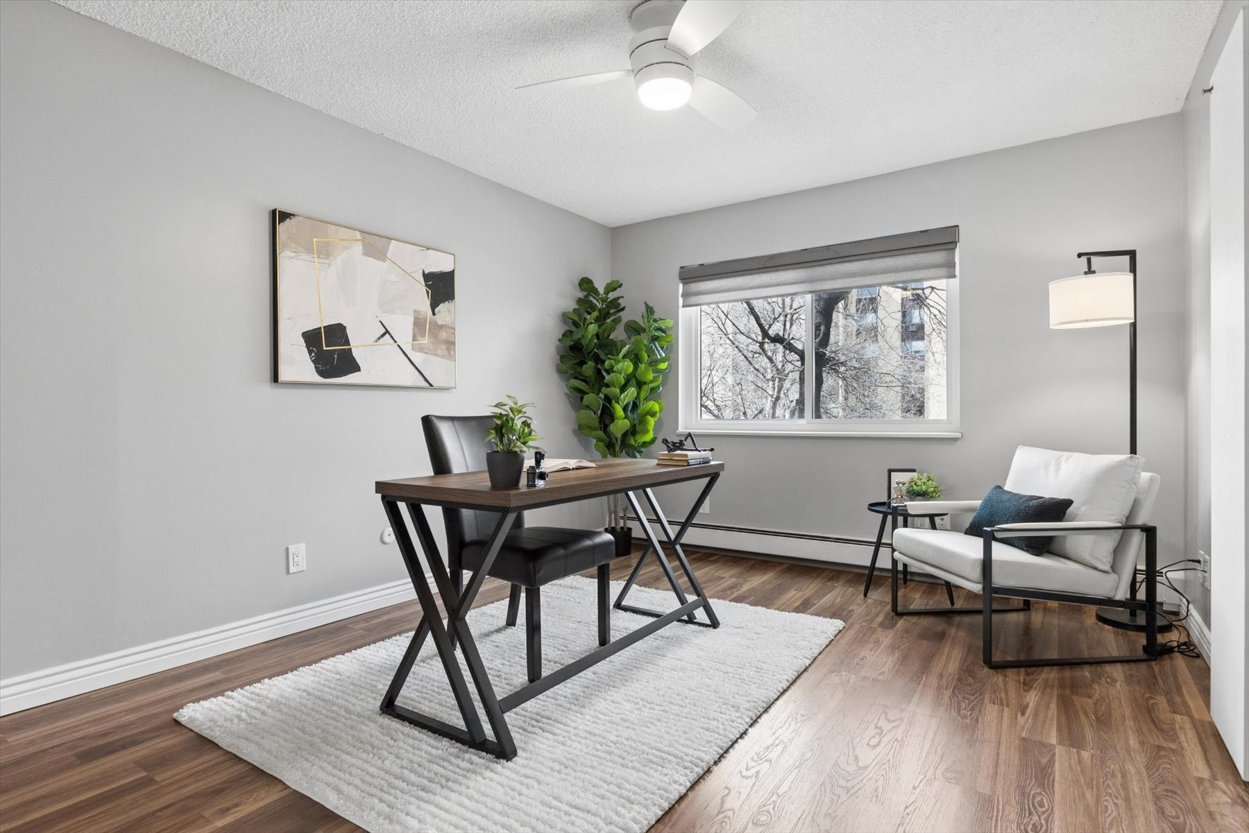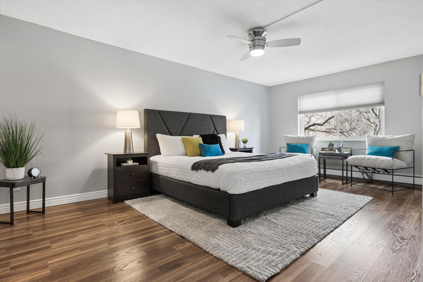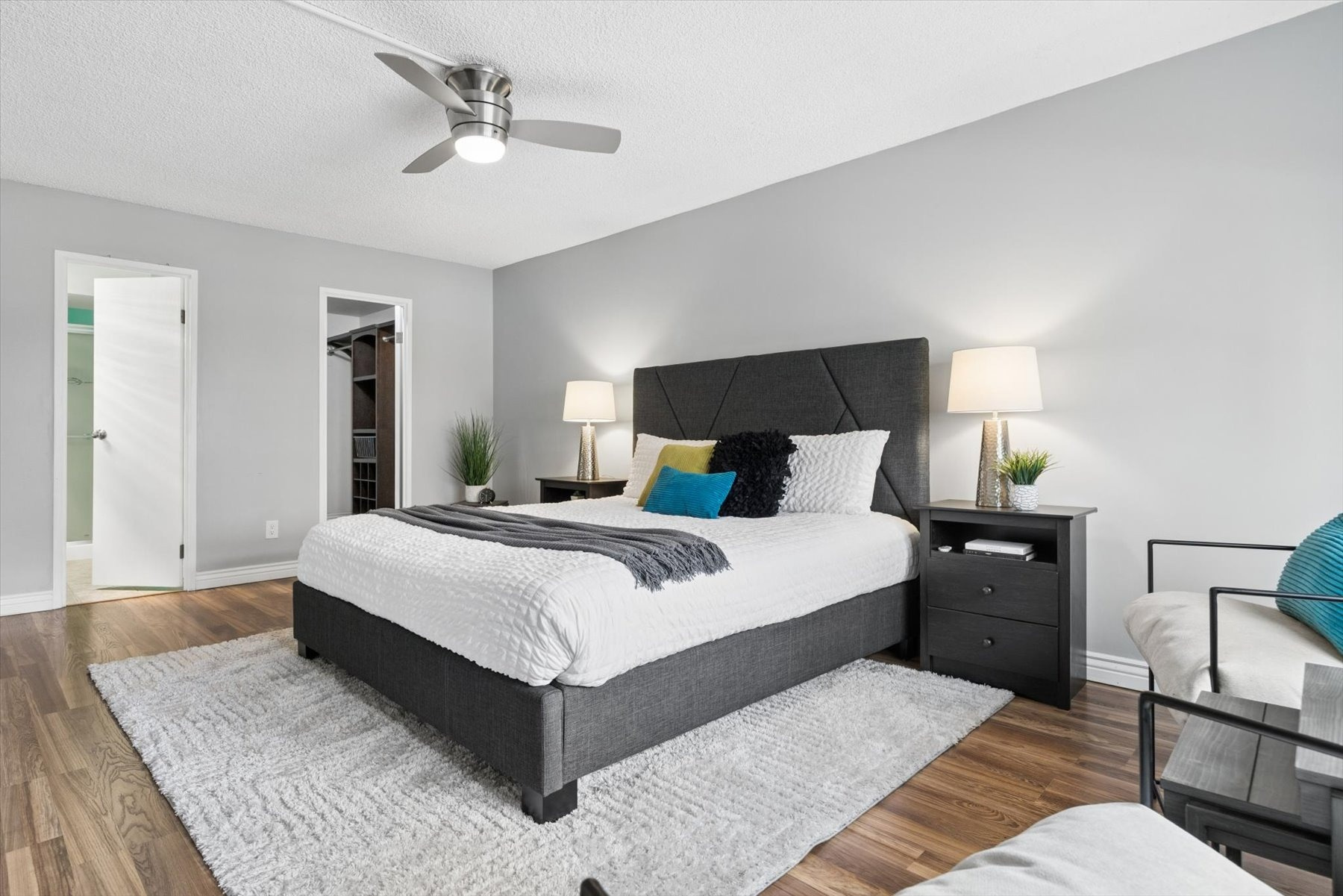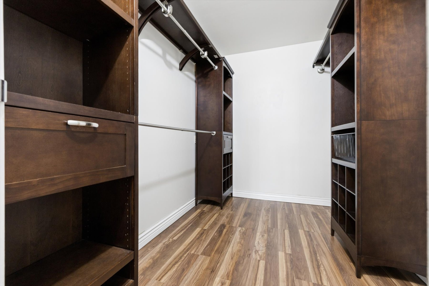 The spacious primary suite includes a walk-in closet with custom built-ins and a remodeled Ensuite bath with a walk-in shower. A second bedroom, or private study, includes a full closet and doors for privacy.